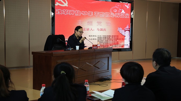 為紀(jì)念改革開放40周年,進(jìn)一步激勵黨員不忘初心、牢記使命。 11月28日,公司黨委牽頭舉辦了 “改革開放四十年 不忘初心再出發(fā)”的主題黨課。120余名黨員在我司大會議室聆聽了講座。本次主題黨課在蘭州市西固區(qū)委組織部和西固區(qū)兩新黨建辦公室指導(dǎo)下開展,本樓宇內(nèi)5家單位以及兩新辦和社區(qū)共同參與。組織這種形式的大黨課,就是貫徹落實(shí)全區(qū)組織工作會議精神,加強(qiáng)“五化五強(qiáng)”黨支部建設(shè),推進(jìn)街道社區(qū)黨建、單位黨建、樓宇黨建互聯(lián)互動,努力提升城市基層黨建工作水平。