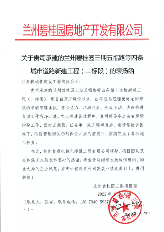 1月10日,我公司收到來自蘭州碧桂園房地產(chǎn)開發(fā)有限公司的表揚函,函中提到,蘭州碧桂園三期五福路等四條城市道路新建工程(二標(biāo)段)項目自開工建設(shè)以來,項目人員面對工期緊、任務(wù)重、施工環(huán)境復(fù)雜、疫情等諸多困難,在保證品質(zhì)的前提下,按期完成了各項施工任務(wù),提出表揚。